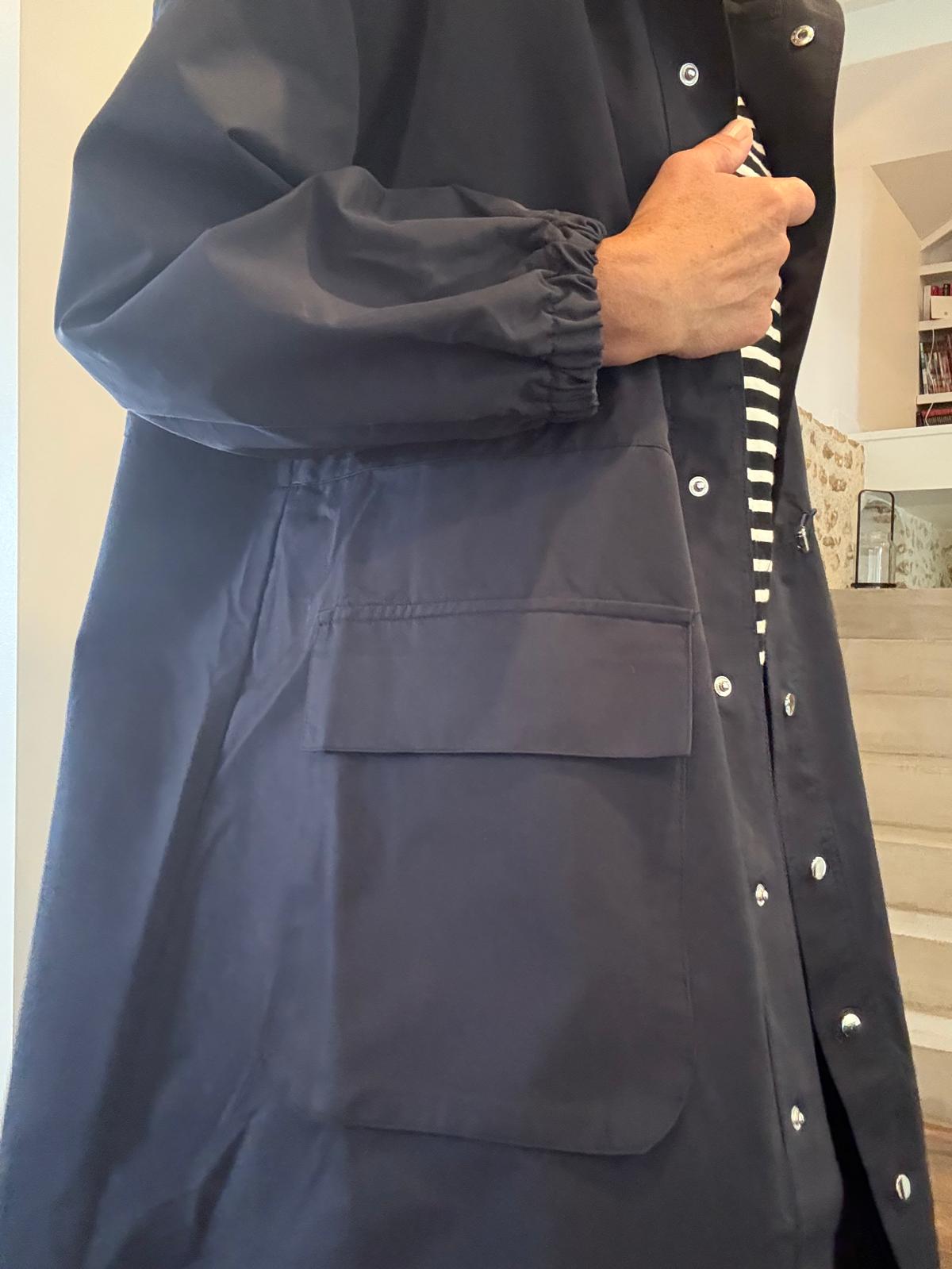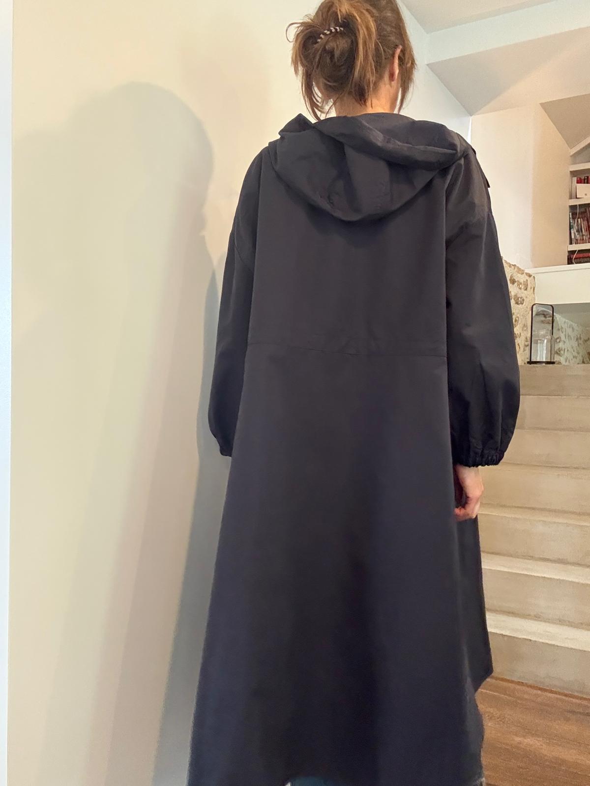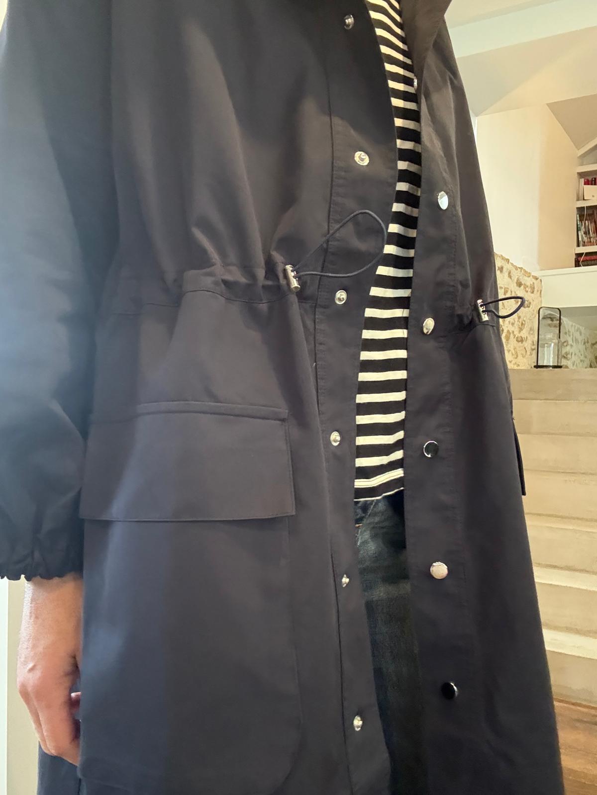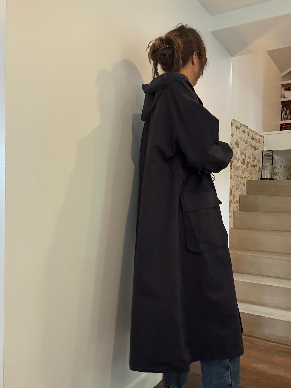 Une coupe de fou pour ce superbe trench qu'on porte aussi bien sur un look casual que working girl. Très joli tombé de manches avec poignets élastiqués, fermeture par pression, 2 grandes poches plaquées, cordon de resserrage à la taille et évidemment une capuche !