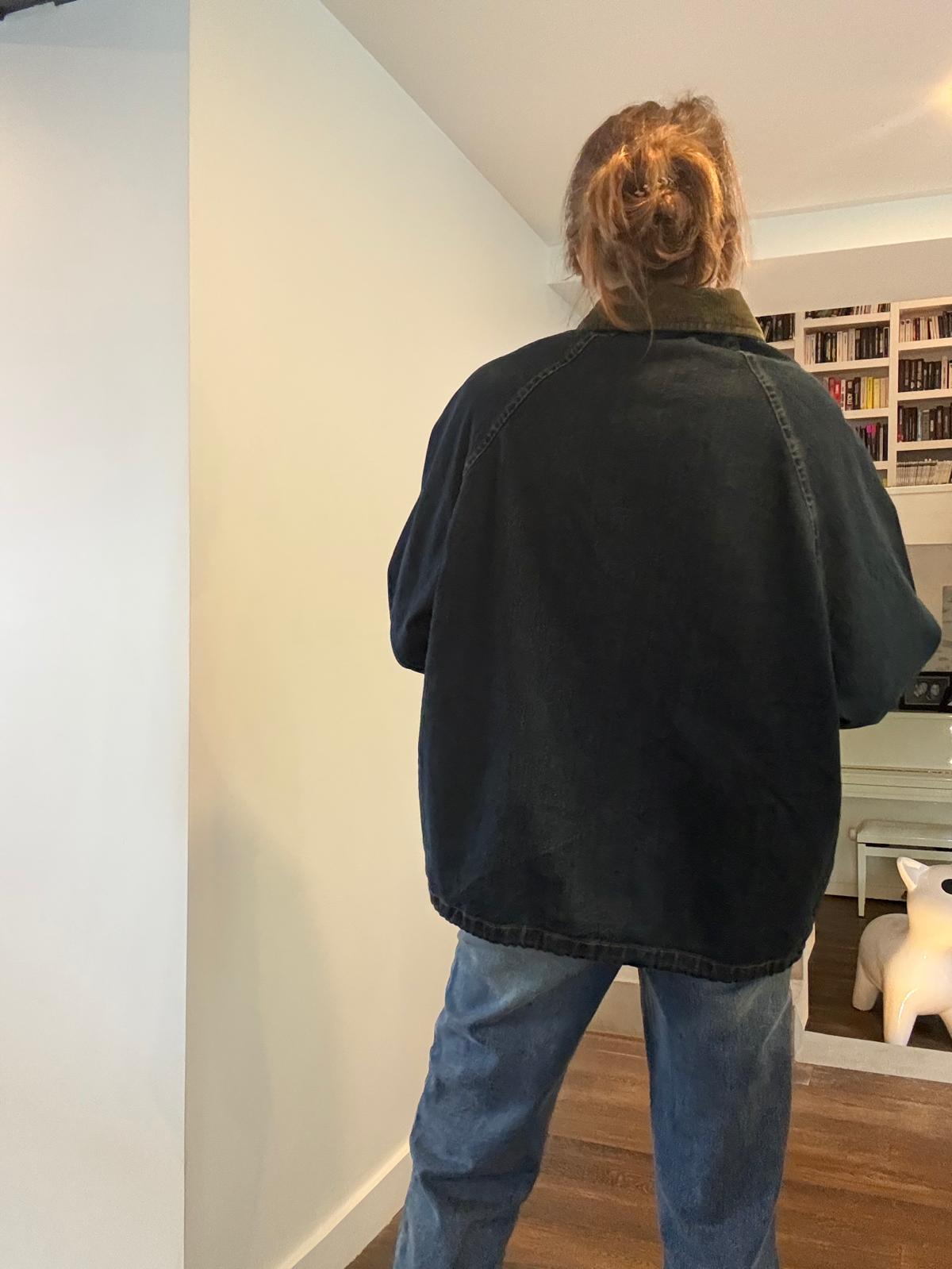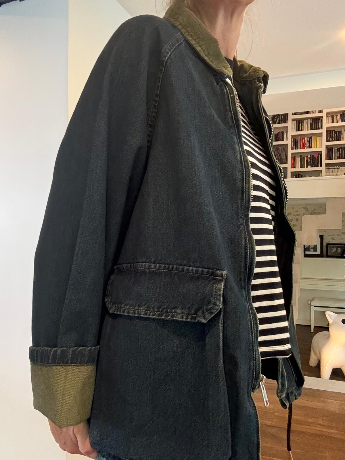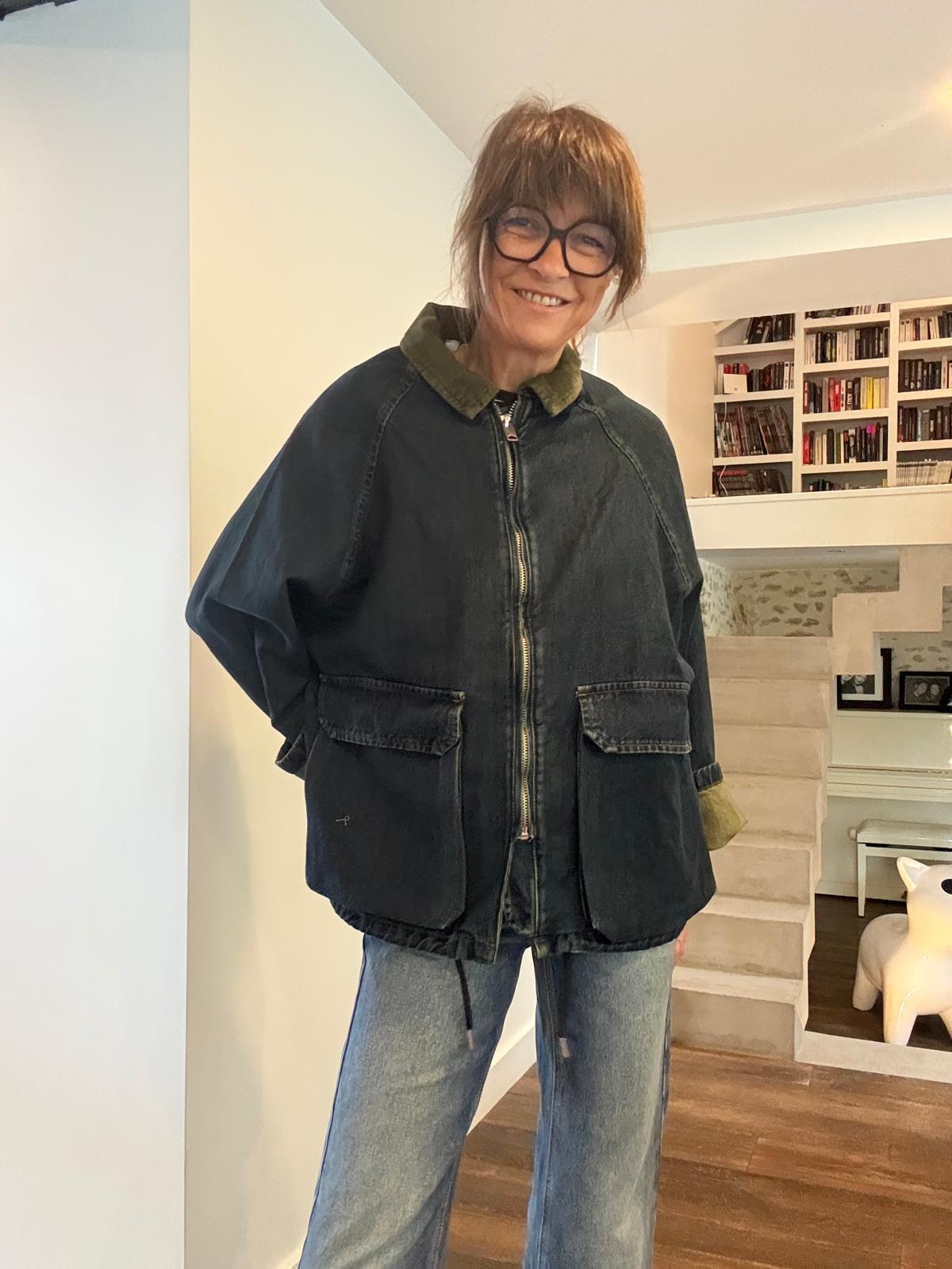 Coup de coeur pour la veste barboum au look british décalé! La Barboum est en jean brut avec une légère teinture kaki en rappel au col en velours kaki, qui lui donne un côté vintage chic. Elle se porte avec le bas de manche retourné pour plus de style. 2 grandes poches plaquées, lien de resserrage en bas (mais on la préfère non resserrée). Le jean est très souple et très agréable à porter.